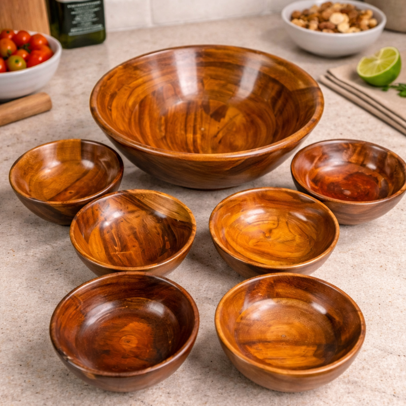 This serving bowl set is lightweight but strong, making it easy to handle and long-lasting. Unlike plastic or glass, wooden bowls are less likely to break, making them a safer option for daily use, especially in busy kitchens. The natural wood also helps keep your food fresh and gives a more organic feel while serving.