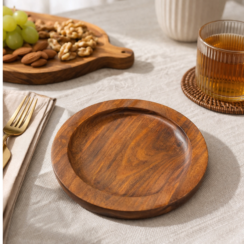This plate is made from high-quality natural wood, which gives it a warm and elegant look. Each piece has its own unique grain pattern, making every plate slightly different and special. The smooth finish ensures it feels soft to the touch and safe for serving food.