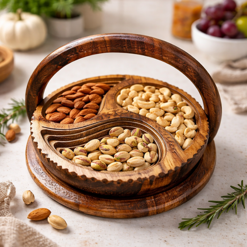 - Premium handcrafted wooden dry fruit bowl with lid