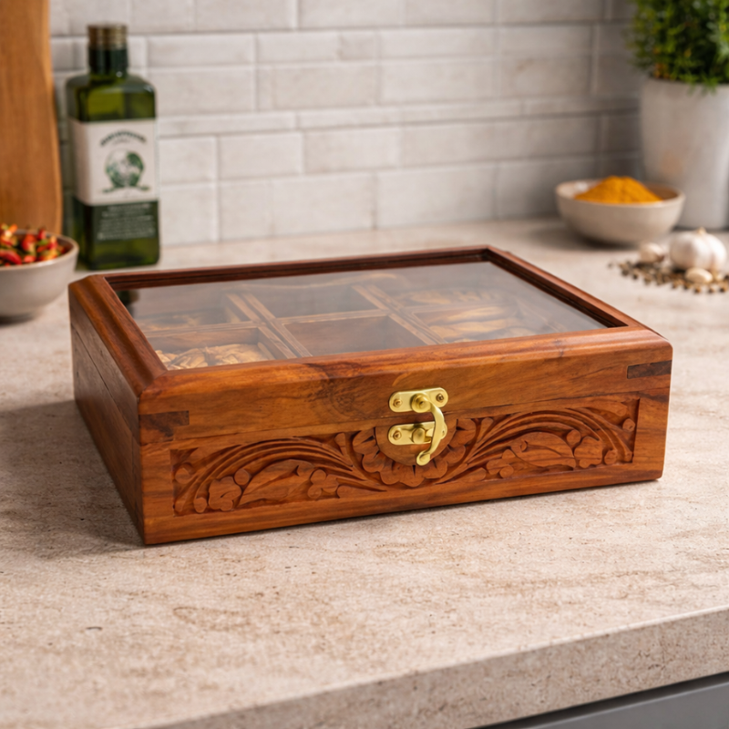 Overall, the Wooden Spice Box with Glass Lid is a practical and stylish solution for organizing your spices. It helps you cook better, stay organized, and add a touch of elegance to your kitchen.