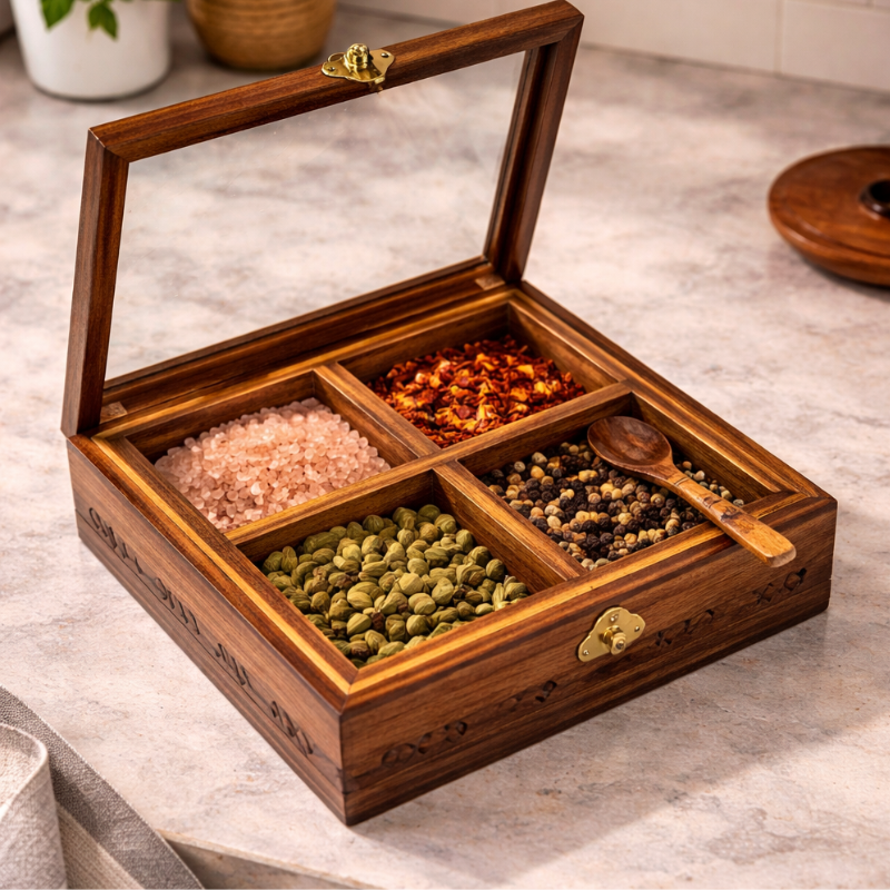 This Wooden Spice Organizer with 4 Compartments organizer is not just useful but also stylish. It fits perfectly in modern, rustic, or traditional kitchens. You can place it on your kitchen counter, dining table, or even use it for serving guests.